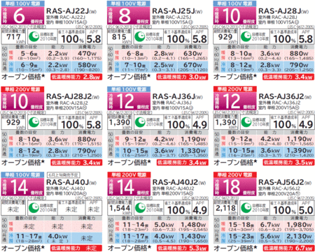 なお、住宅設備用販売モデルではAJシリーズとなり、RAS-AJ○○Jと言う型式になります。主な機能は同じですが仕様やラインナップ、本体色等若干の差異がございます。詳細につきましてはカタログ等でご確認ください。