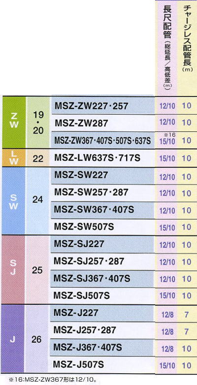 家電ルート商品の室内機と室外機の高低差や接続する配管の長さは下記をご覧下さい。