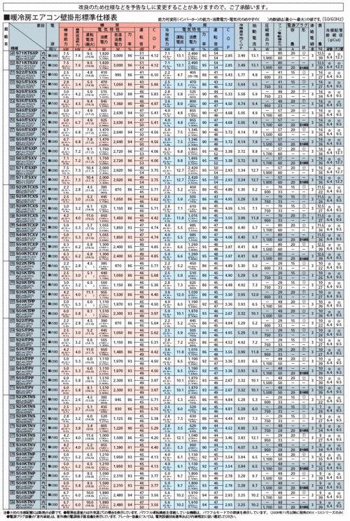 ダイキン量販店向けエアコン仕様表