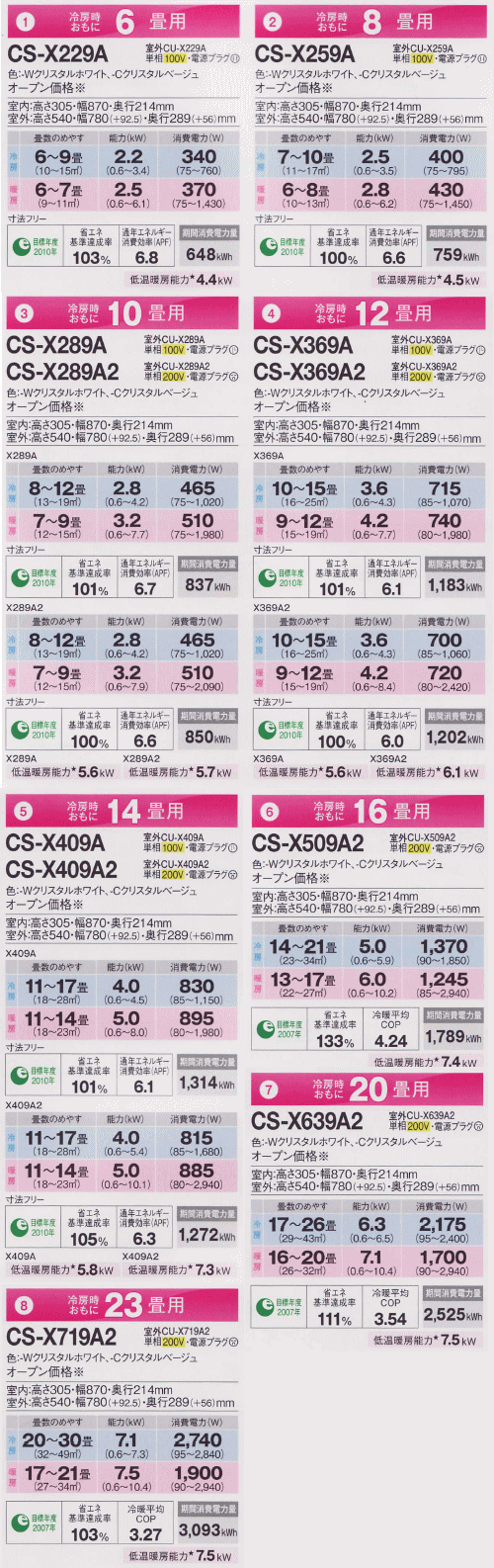 2009年パナソニックエアコンXシリーズです。品番はCS-X○○9Aで数字の末尾「9」が2009年モデルを表しています。ここが「8」なら2008年「7」なら2006年モデルです。類似機種としては量販店向け機種CS-○○RKXや設備ルーと向け機種としてCS-○○9XBと言う機種もあります。主な機能は同じですが詳細はカタログ等でご確認ください。