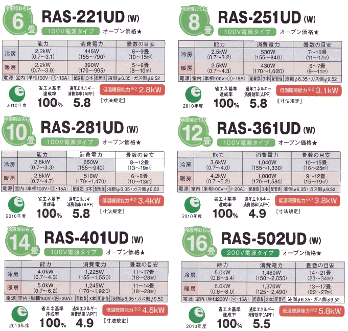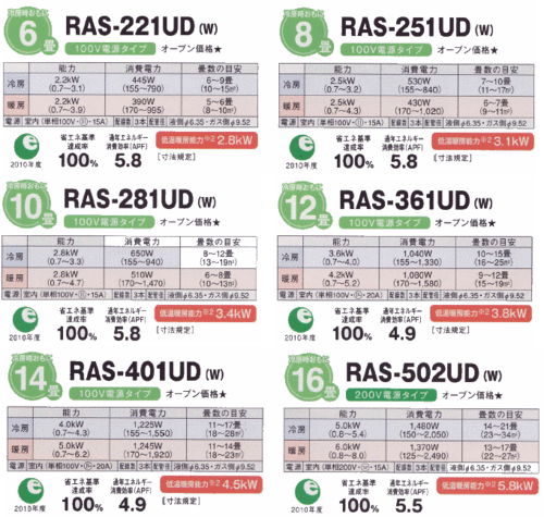 2010年東芝エアコンのコンパクトモデルUDシリーズです。品番はRAS-○○○UDで○○○の数字の後が「U」が2010年モデルを表しています。類似機種は設備ルート向けにRAS-○○○0Dと言う機種もあります。
