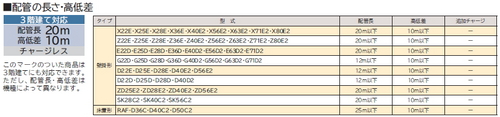 室内機と室外機の高低差や接続する配管の長さは下記をご覧下さい。